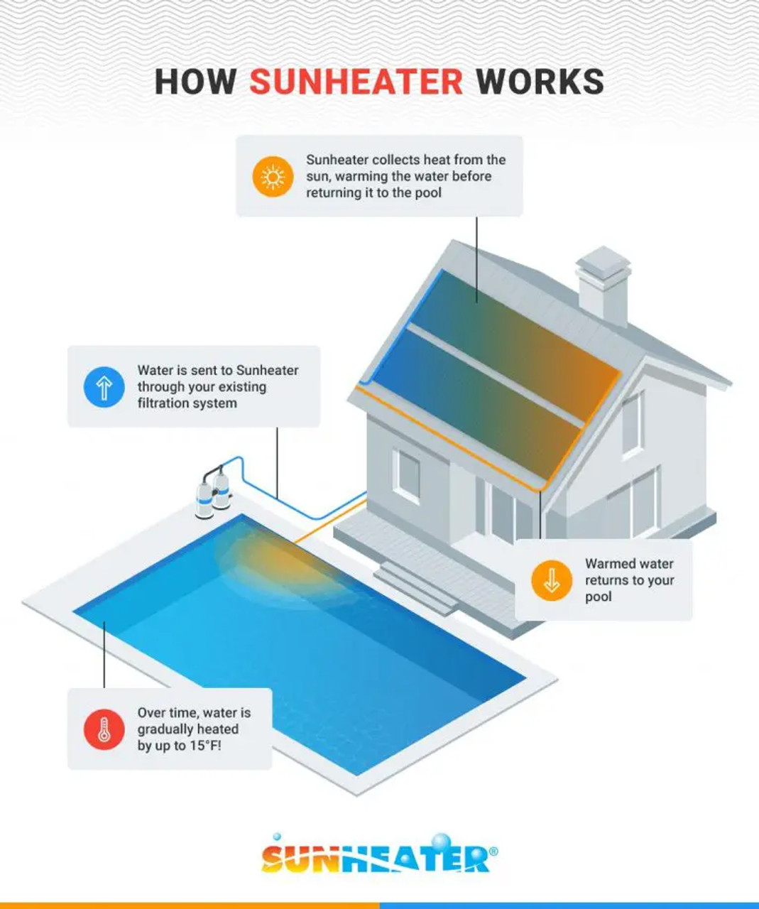The Sun Heater Solar Heating System can increase your water temperature by 15°F! The Sun Heater can be installed on a roof, fence, or even on the ground near your pool to collect the sun’s warmth. The best part is, after installation, this system is virtually free, because it works in tandem with your pool's heat pump, which you would be running regardless. The system is simple, your pump pushes water into the Sun Heaters tubes where it can be heated and returned to your pool. This way, you will be able to add extra weeks onto your swimming season!
