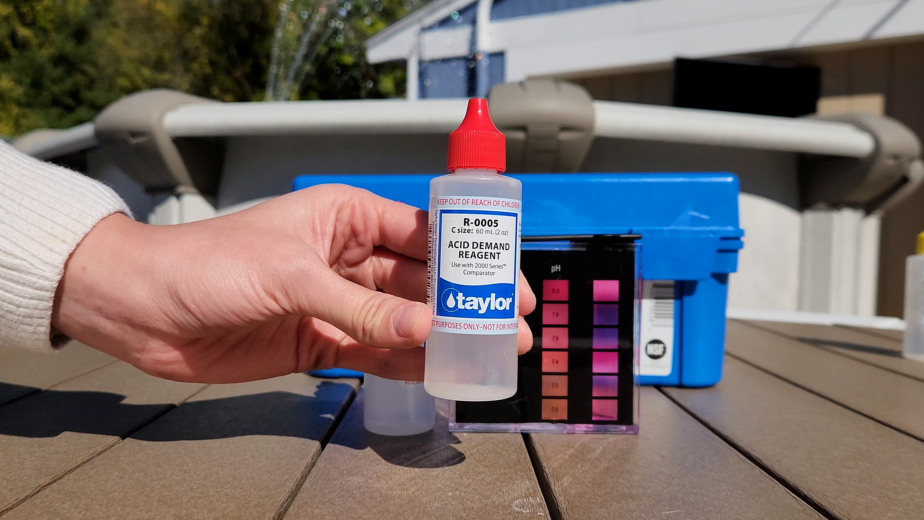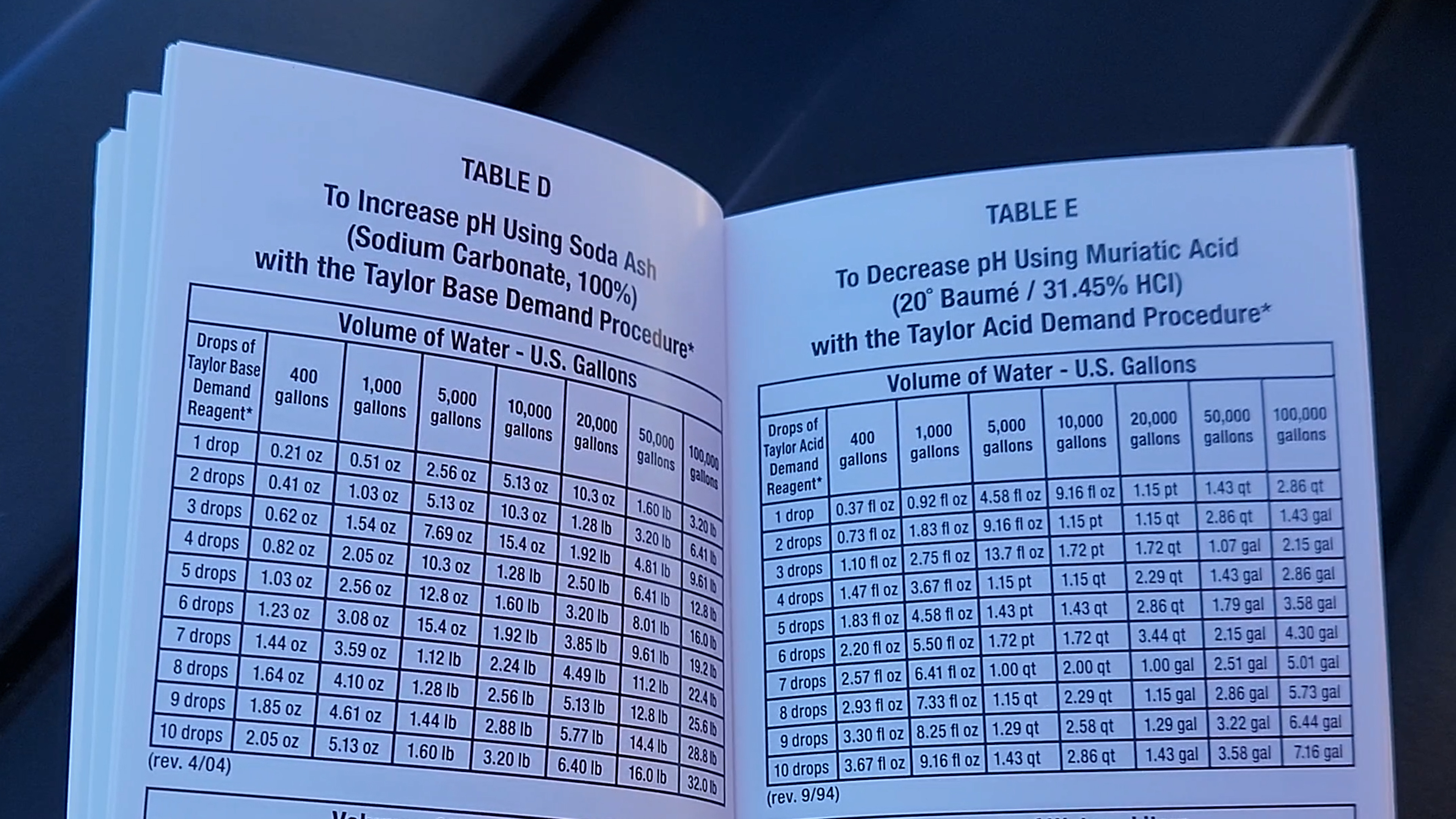 Add one drop at a time, matching the color to the ideal range. Record the number of drops and use Tables D and E in the Taylor guidebook to determine the correct dosage for your pool size.